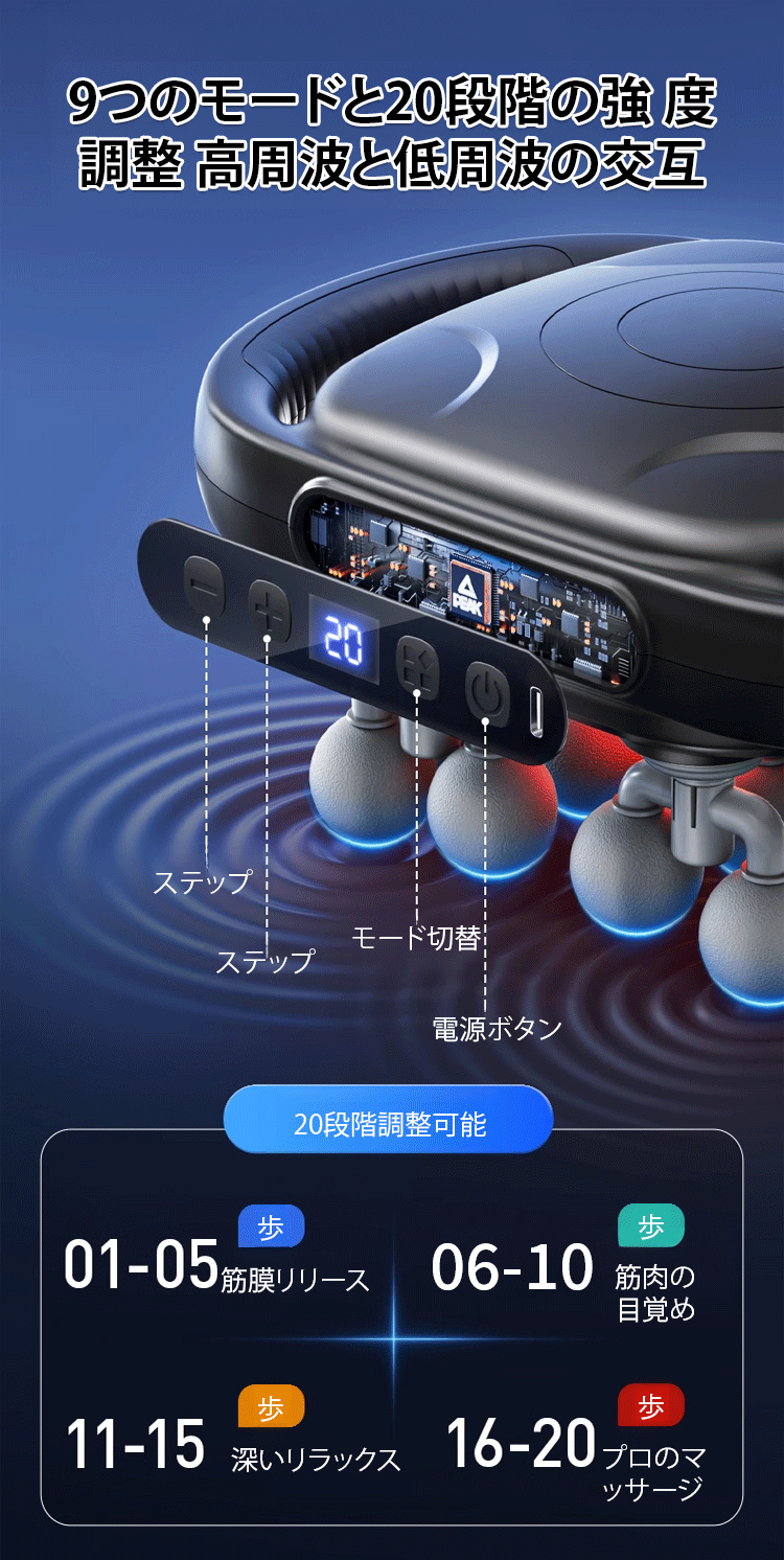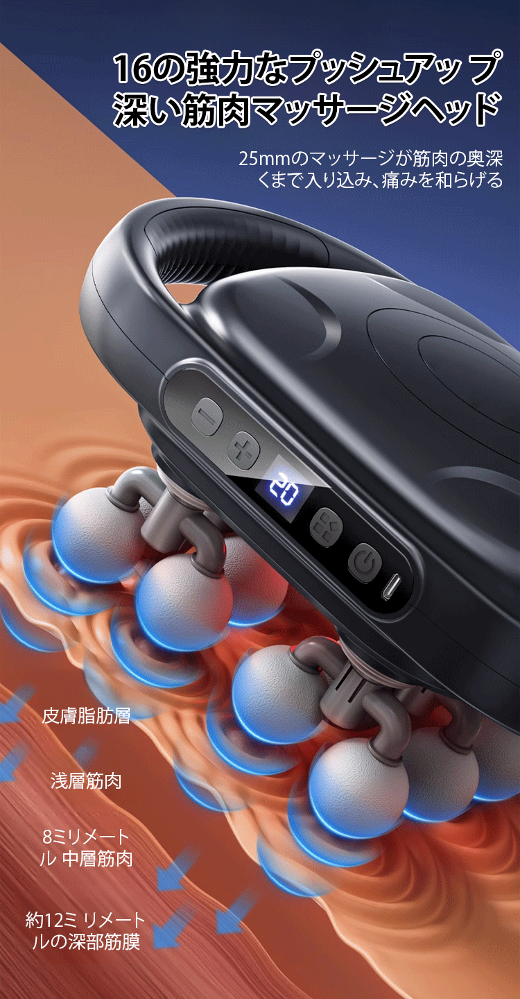 16頭筋膜ガンは強力で広範囲に全身をマッサージします。